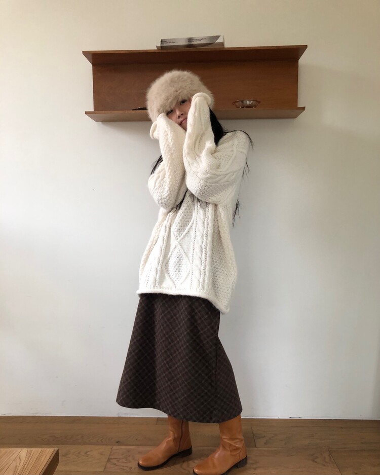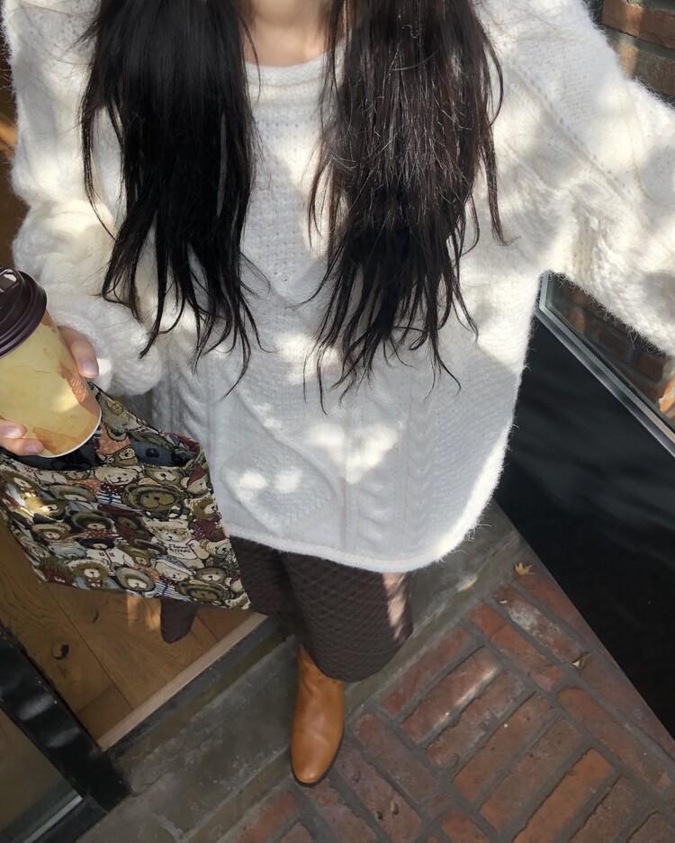긴 소매 기장감으로 겨울 아이템임에도 여리여리한 실루엣 연출