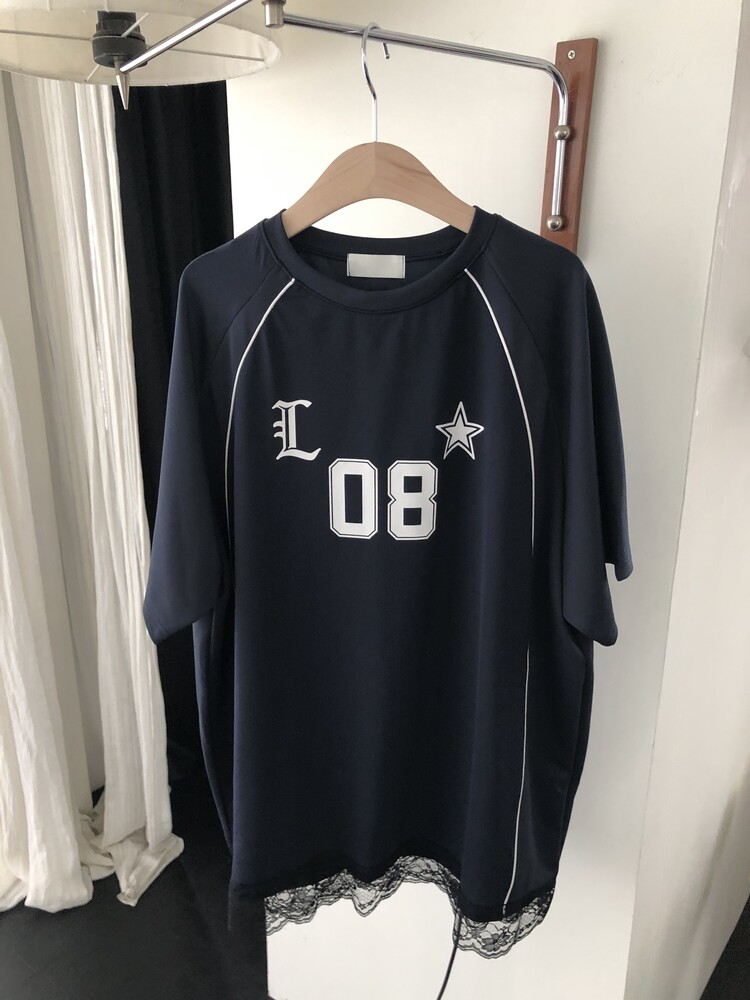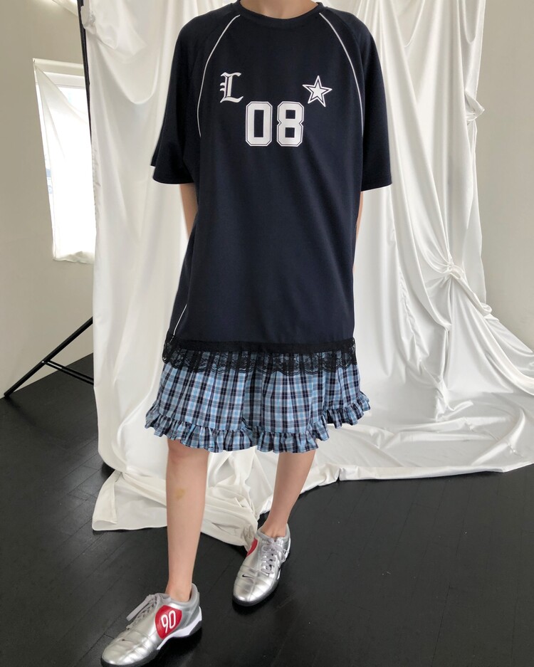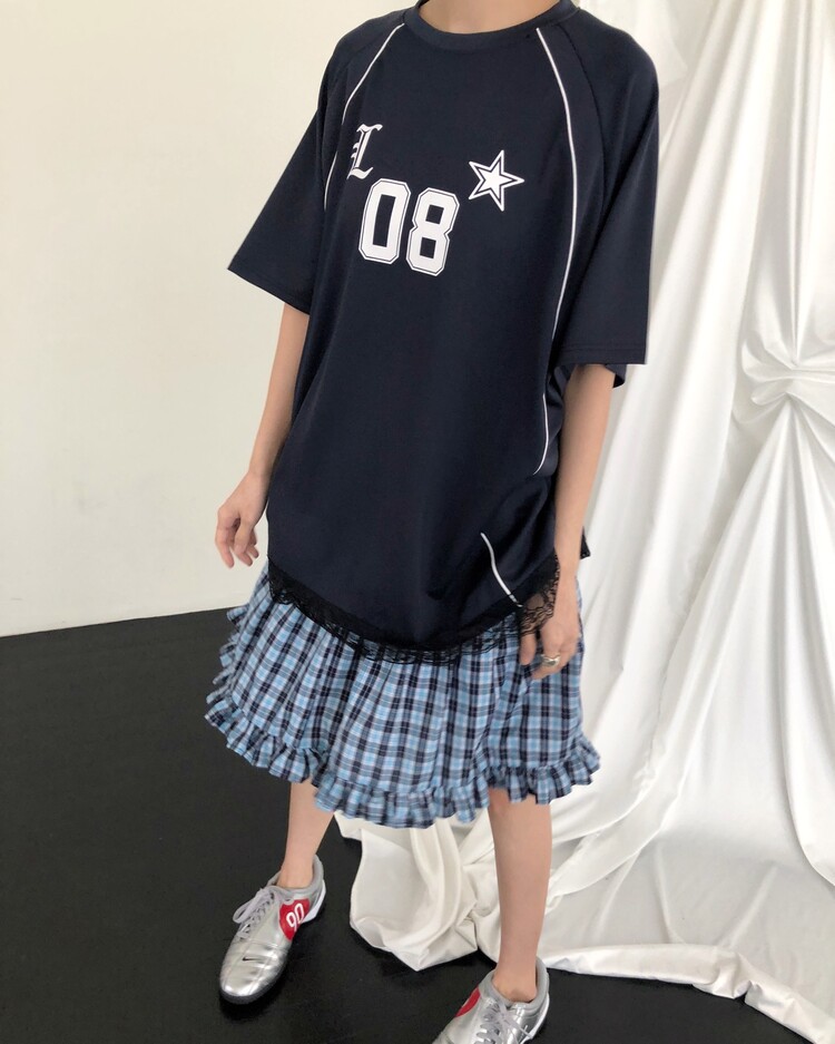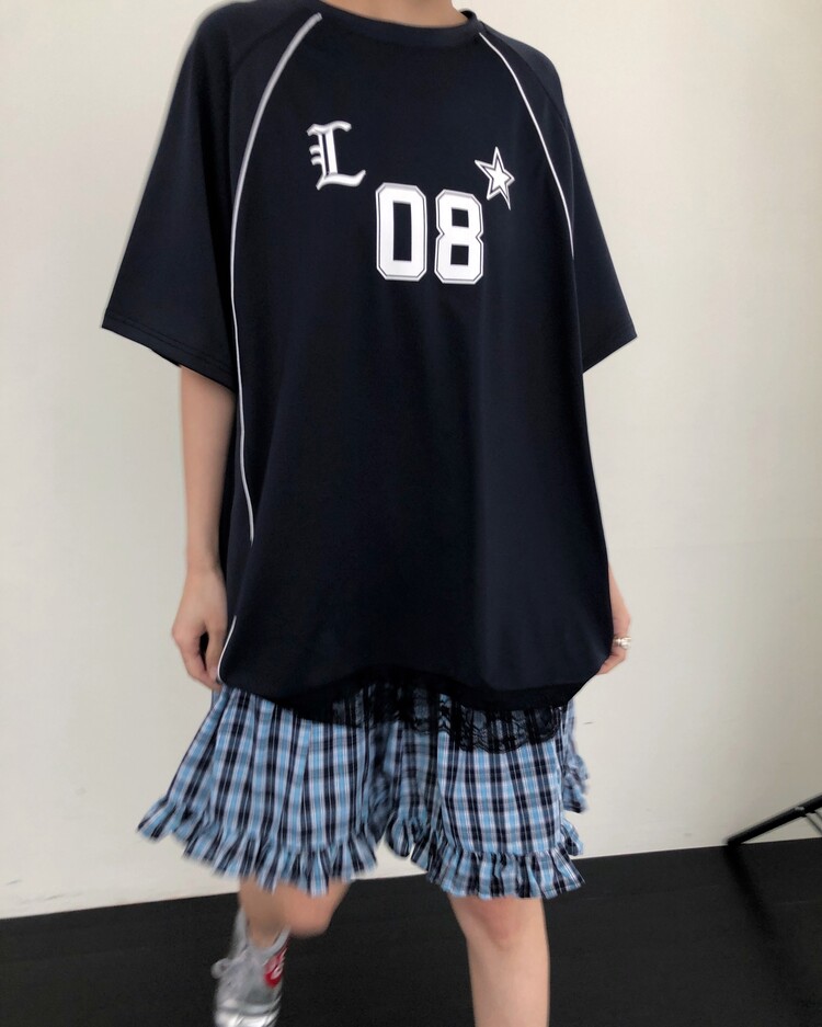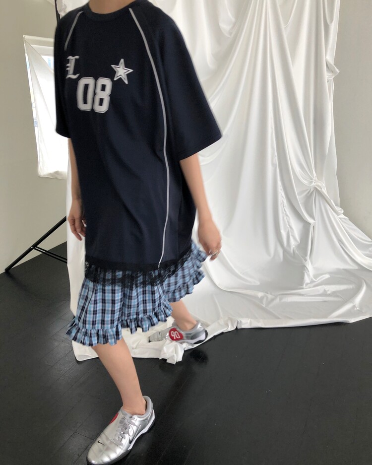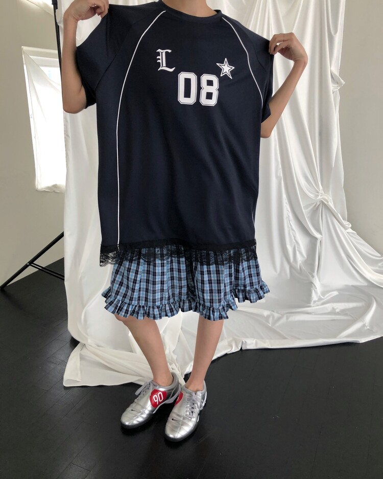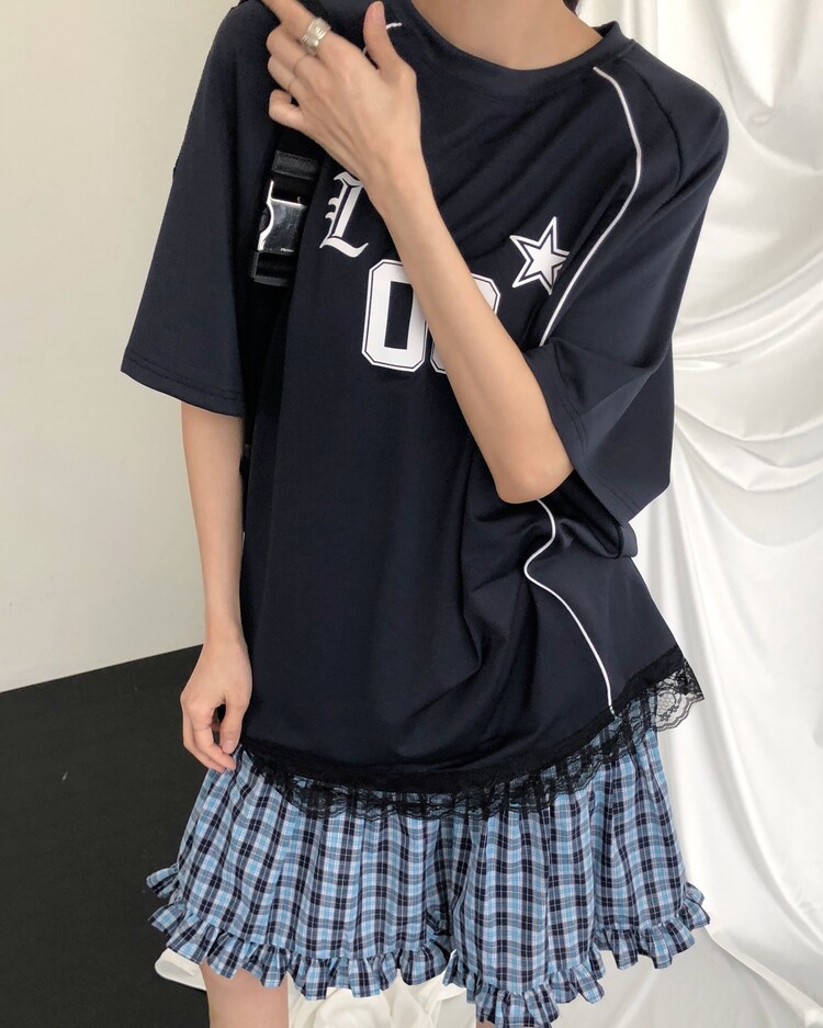 -유니크한 룩으로 완성시켜주는 레이스 배색 오버핏 반팔 티셔츠