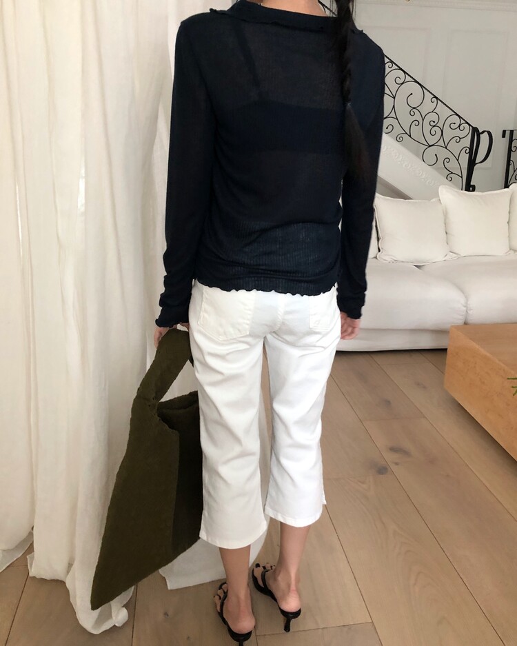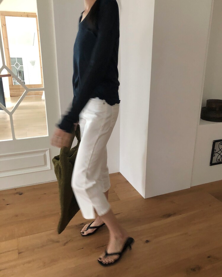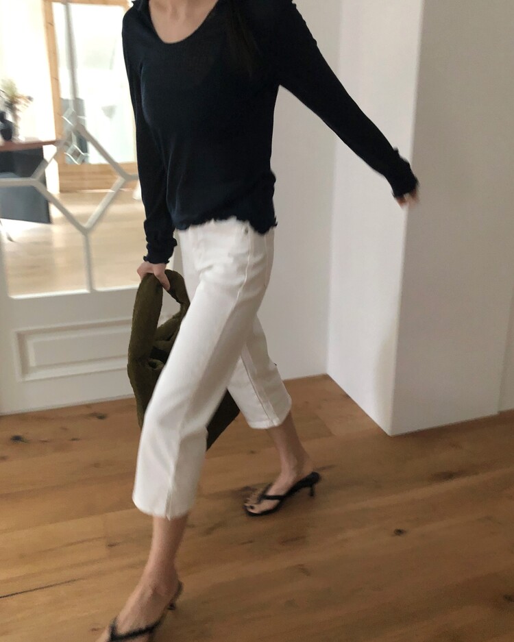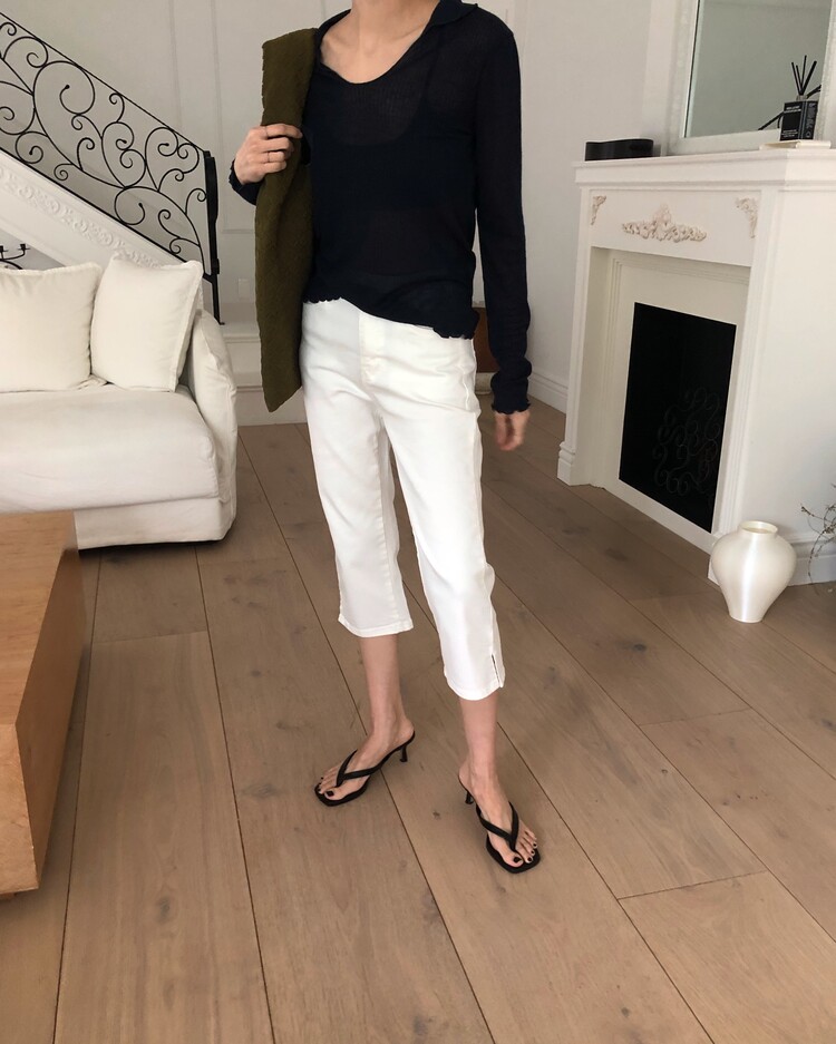 -9부 카프리 기장으로 설계되어 다리가 더욱 길어 보이며, 데일리하면서도 격식 있는 자리까지 활용 가능한 아이템