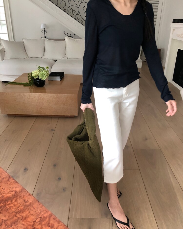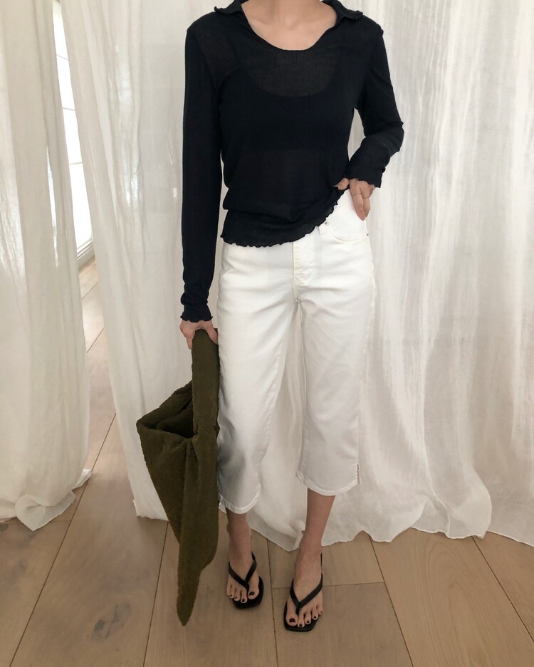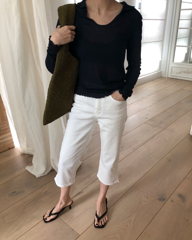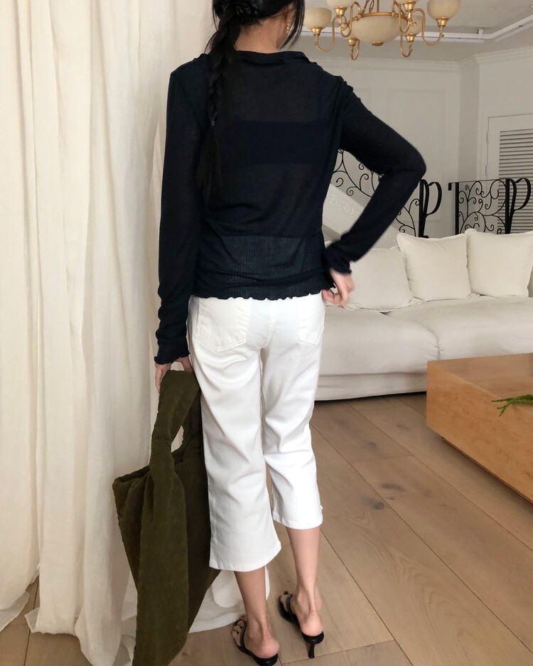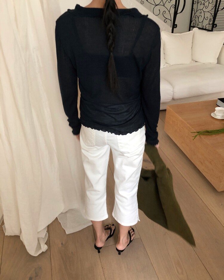 -9부 카프리 기장으로 설계되어 다리가 더욱 길어 보이며, 데일리하면서도 격식 있는 자리까지 활용 가능한 아이템
