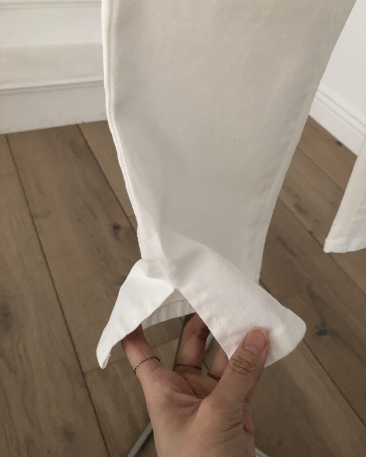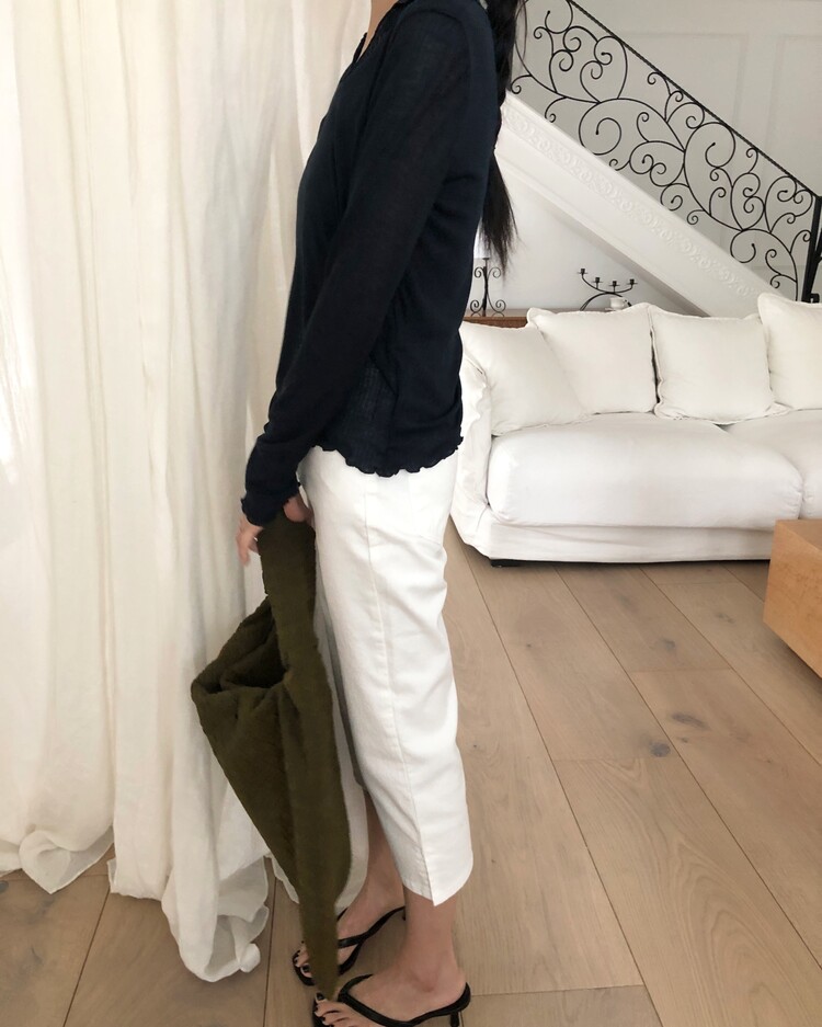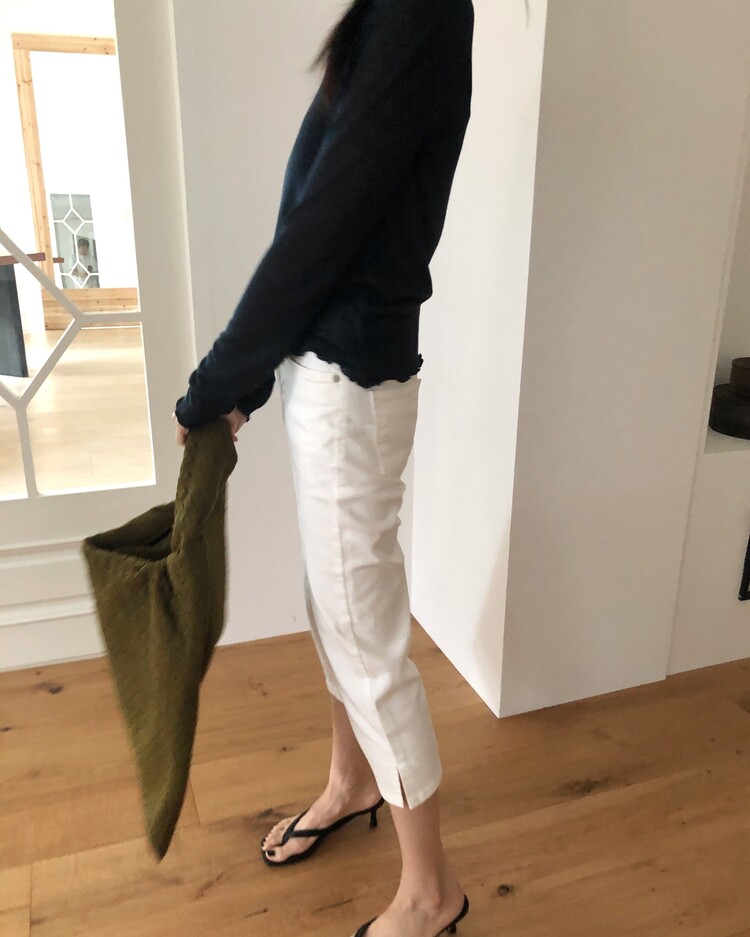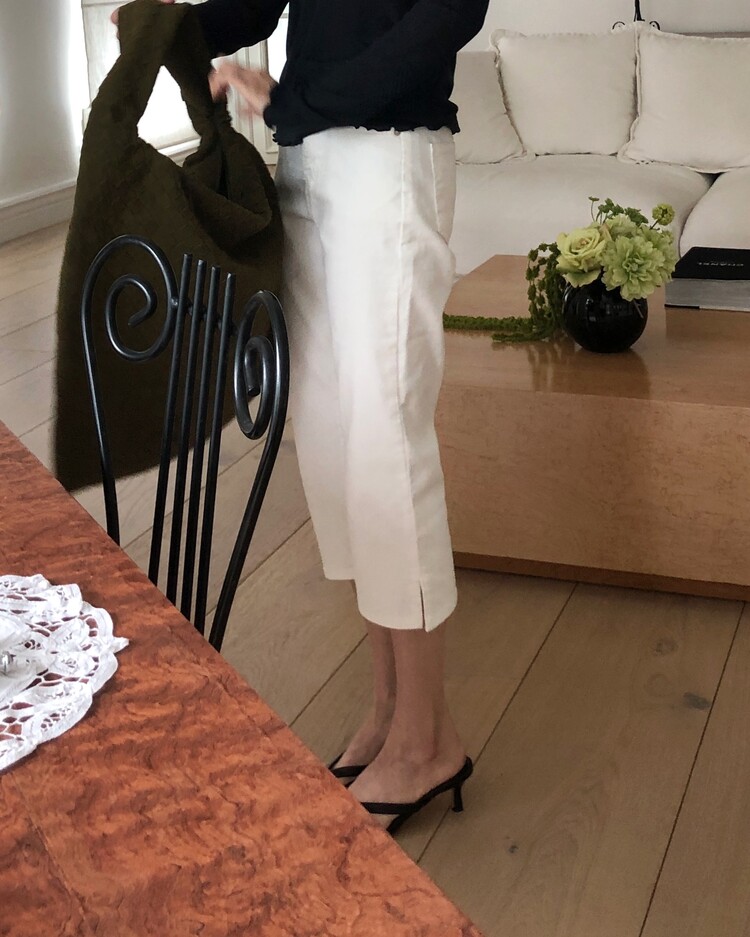 -밑단 옆면에 더해진 슬릿 디테일로 종아리 라인이 부각되지 않도록 여유로운 아웃핏 완성
