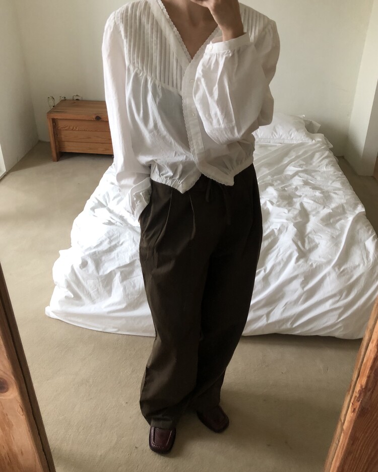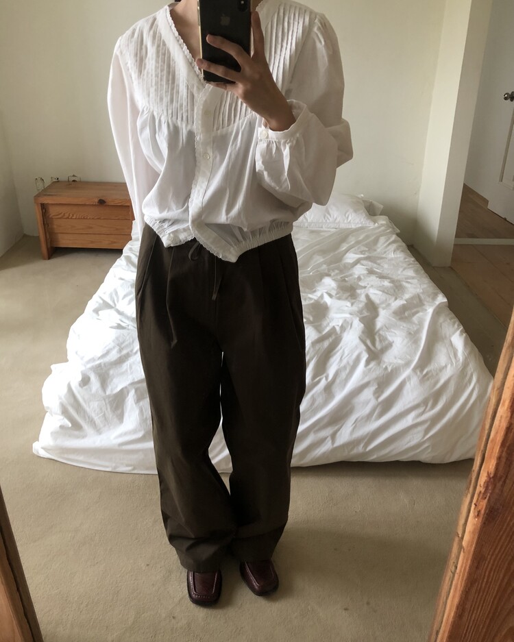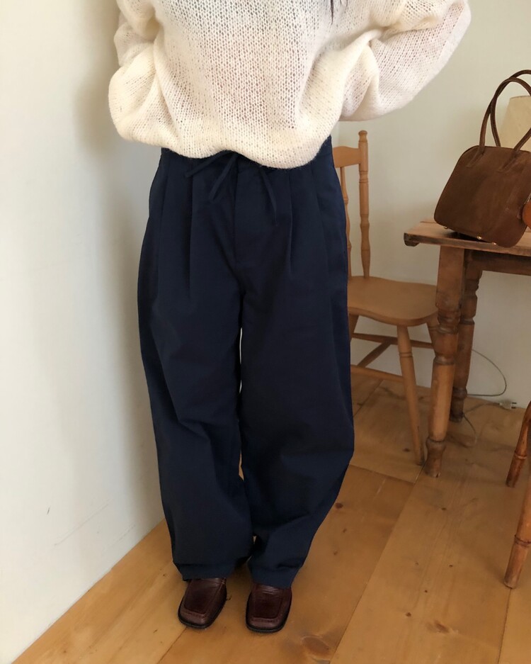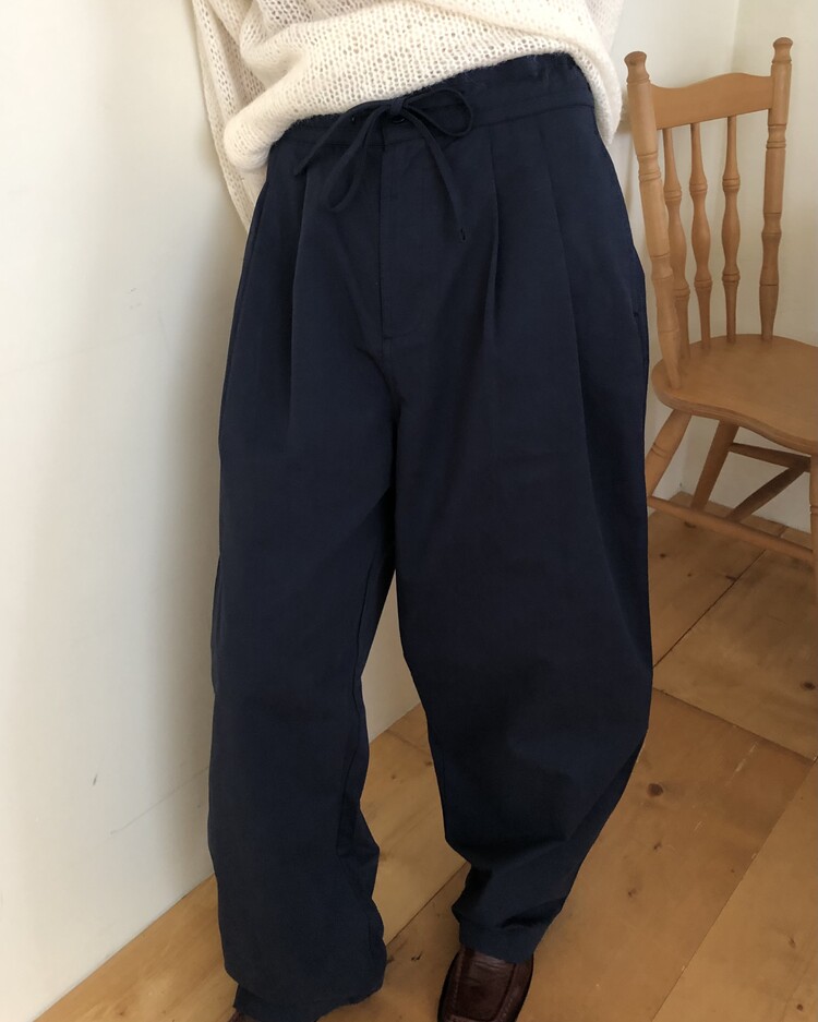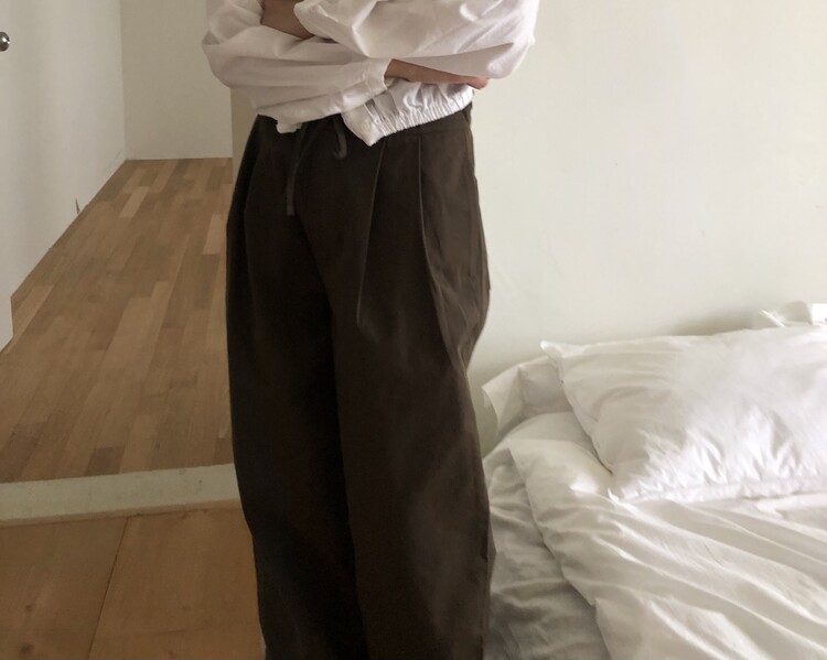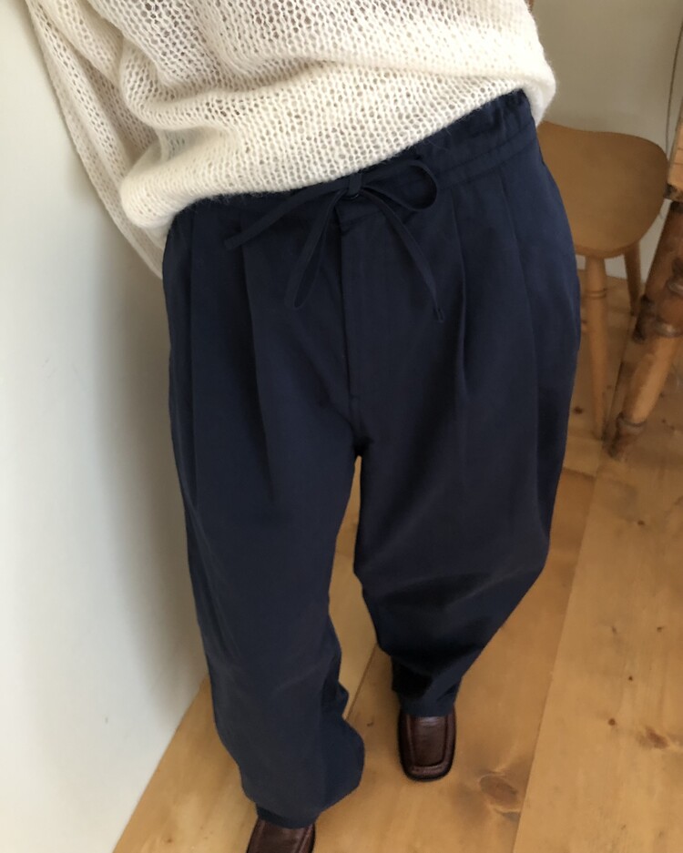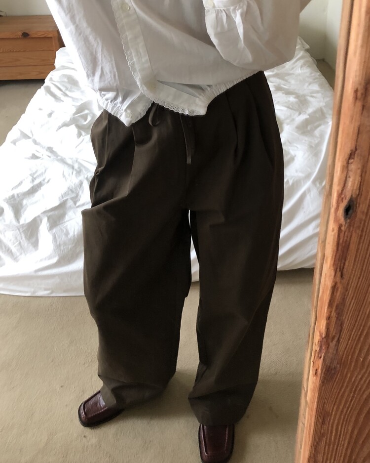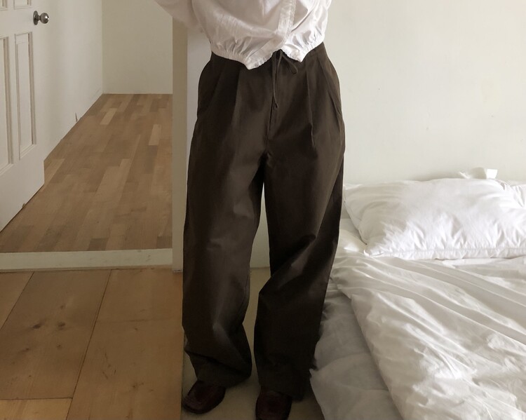 -프론트 핀턱 디테일과 허리 스트랩으로 편안한 착용감의 코튼 팬츠